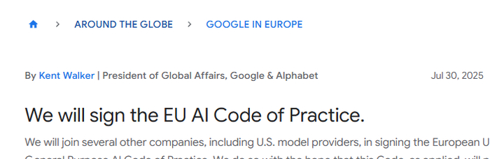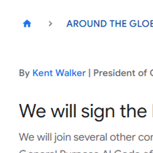 当地时间周三(7月30日),谷歌全球事务总裁肯特·沃克(Kent Walker)在官方博客写道,“我们将与包括美国模型提供商在内的其他几家公司签署欧盟《通用人工智能实践准则》。”