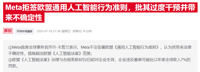 这一表态正值Meta最近公开拒绝签署该准则,Meta的理由是担心准则会限制欧洲的创新。Meta称这是一种“越权”,将“扼杀”行业发展。