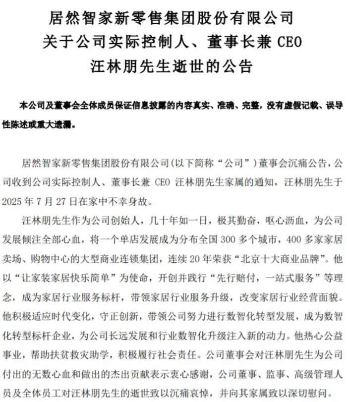 7月23日,居然智家(000785.SZ)发布公告:武汉市江汉区监察委员会对汪林朋 “解除留置,变更为责令候查” 。四天后,这位57岁的家居巨头掌舵人从家中高楼纵身跃下,生命戛然而止。