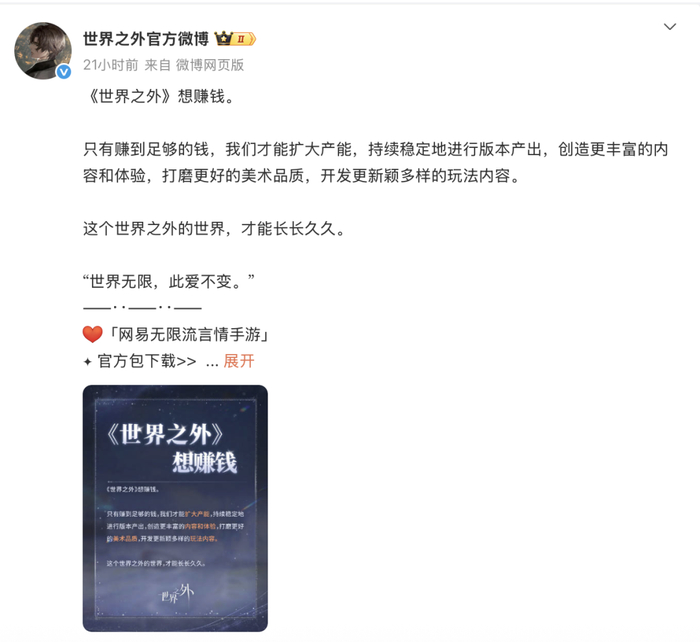 7月29日晚间,网易旗下女性向游戏《世界之外》在各大社交平台连发多则公告,针对近期的一系列争议事件作出回应。其中一则公告称,“《世界之外》想赚钱。只有赚到足够的钱,我们才能扩大产能,持续稳定地进行版本产出,创造更丰富的内容和体验,打磨更好的美术品质,开发更新颖多样的玩法。”