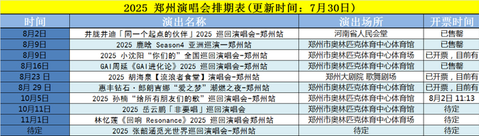 最新!郑州2025年8月-10月演唱会排期表来啦→