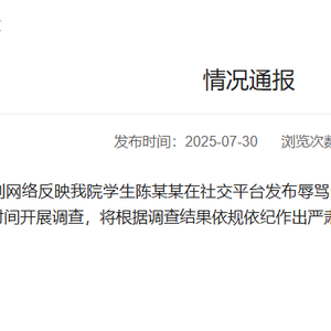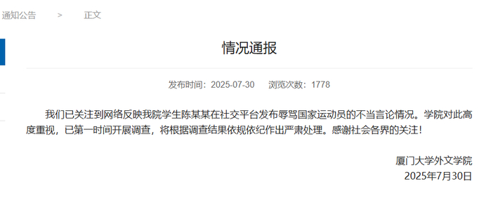 7月30日,厦门大学外文学院发布情况通报:我们已关注到网络反映我院学生陈某某在社交平台发布辱骂国家运动员的不当言论情况。学院对此高度重视,已第一时间开展调查,将根据调查结果依规依纪作出严肃处理。感谢社会各界的关注!