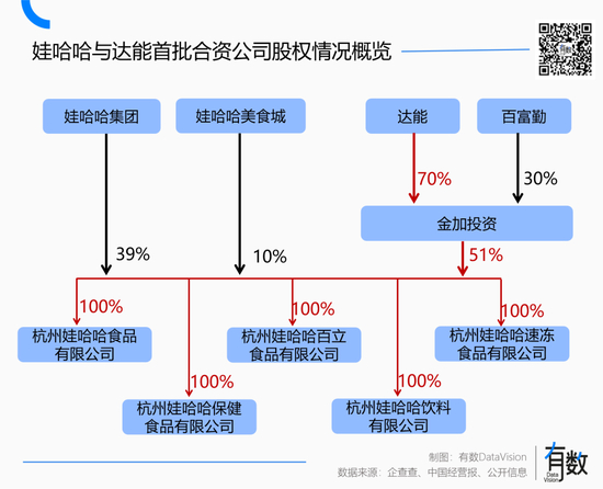 但在具体的持股形式上,达能与百富勤成立离岸公司金加投资有限公司,合计持有了合资公司51%的股权,娃哈哈通过两个主体,持有49%的股权。