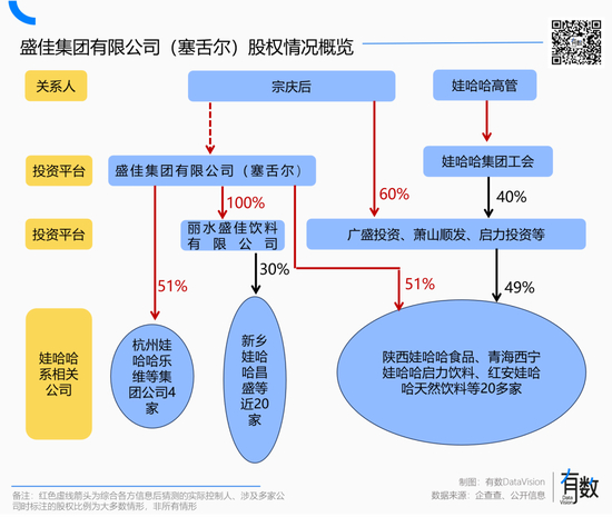 举例来说,投资平台之一的盛佳集团有限公司(塞舌尔)为离岸公司,很难穿透背后股东,但旗下绝大部分参投公司的法人与董事长都曾由宗庆后担任。