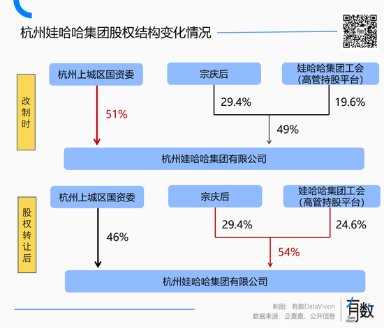1999年,杭州上城区校办经销部改制,杭州上城区国资委资持股51%,宗庆后与核心管理层后出资持有49%,构成了娃哈哈最早的雏形。