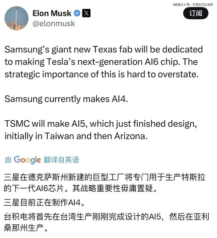 马斯克在X上发帖称:“三星在得克萨斯州新建的巨型工厂将专门用于生产特斯拉的下一代AI6芯片。其战略重要性毋庸置疑。”