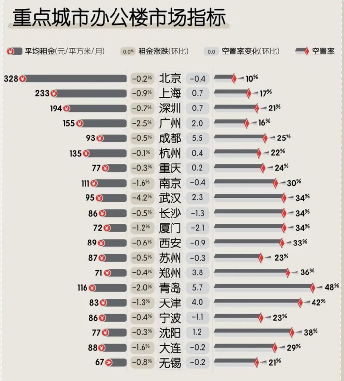 基础设施方面,以写字楼为例,全国最大40城甲级写字楼存量已经超过1.1亿平方米,最大20城中,去年底写字楼空置率低于30%的仅有8个,像沈阳、郑州、武汉、青岛等前几年大基建扩张比较猛的城市,空置率已达40%左右。而像东京、巴黎都在7%以下,香港虽然不景气,空置率只有9%左右,是全国空置率最低的城市。过高的空置率导致业主不得不竞相打折出租,全国甲级写字楼每平米出租均价从2019年的147元/月,降至去年的82元/月。
