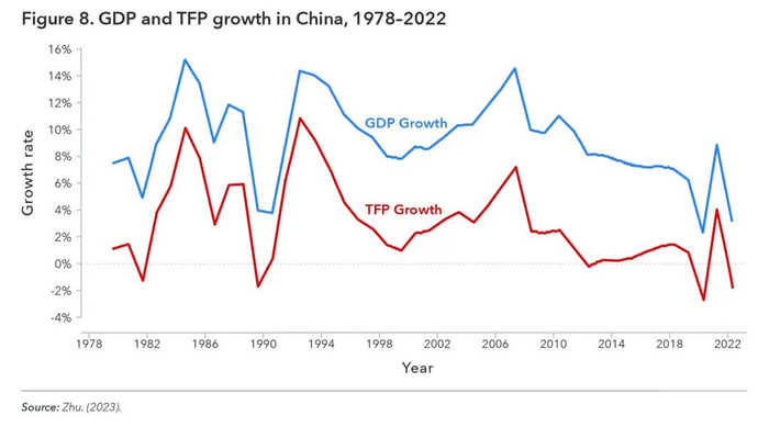中国于2010年左右实现工业化之后,就开始陷入内卷化通道,2015年之后内卷进一步加速。1992年至2008年之间,中国的全要素生产率(TFP)保持4%左右的增长,2008年后陡降,2015年之后总体负增长(2016年为0.46左右、2024年则为0.41左右),这意味着追加各种生产要素投资的边际效应开始逐步丧失了。