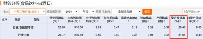 而根据申万二级白酒行业的数据,行业资产负债率均值仅为26.46%,行业中值也只是31.04%。
