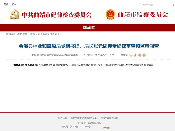 昆明信息港讯 机器人小明 据会泽县纪委监委消息:会泽县林业和草原局党组书记、局长张元周涉嫌严重违纪违法,目前正接受会泽县纪委监委纪律审查和监察调查。