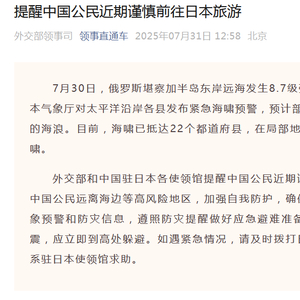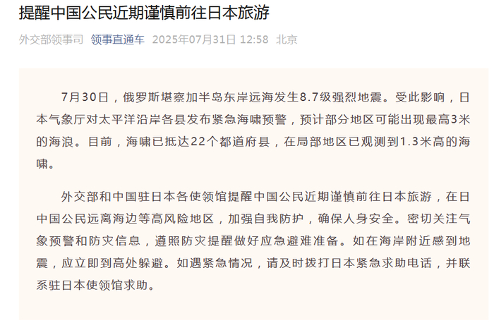 7月30日,俄罗斯堪察加半岛东岸远海发生8.7级强烈地震。受此影响,日本气象厅对太平洋沿岸各县发布紧急海啸预警,预计部分地区可能出现最高3米的海浪。目前,海啸已抵达22个都道府县,在局部地区已观测到1.3米高的海啸。外交部和中国驻日本各使领馆提醒中国公民近期谨慎前往日本旅游,在日中国公民远离海边等高风险地区,加强自我防护,确保人身安全。密切关注气象预警和防灾信息,遵照防灾提醒做好应急避难准备。如在海岸附近感到地震,应立即到高处躲避。如遇紧急情况,请及时拨打日本紧急求助电话,并联系驻日本使领馆求助。※日本紧急求助电话:119(急救、消防)、110(警察)、118(海上事故、海难)日本气象厅中文信息网站:https://www.data.jma.go.jp/multi/index.html?1ang=cn_zs外交部全球领事保护与服务应急热线(24小时):+86-10-12308、+86-10-65612308驻日本大使馆领事保护与协助电话:+81-3-6450-2195驻大阪总领馆领事保护与协助电话:+81-6-6445-9427驻福冈总领馆领事保护与协助电话:+81-92-753-6483驻札幌总领馆领事保护与协助电话:+81-11-513-5335驻长崎总领馆领事保护与协助电话:+81-95-849-3311驻名古屋总领馆领事保护与协助电话:+81-52-932-1036驻新潟总领馆领事保护与协助电话:+81-25-228-8888
