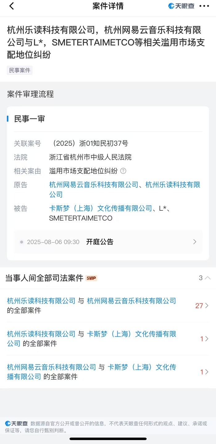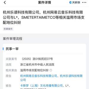 天眼查APP显示,近日,法院公开杭州乐读科技有限公司、杭州网易云音乐科技有限公司起诉SM ENTERTAINMENT CO. 、L*、卡斯梦(上海)文化传播有限公司的开庭信息,案由涉及滥用市场支配地位纠纷。