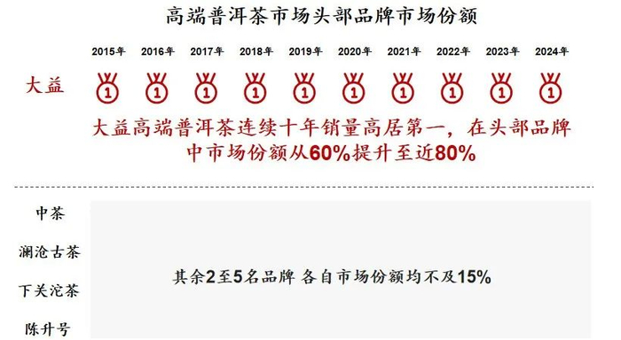 据灼识咨询统计,大益在高端普洱茶市场,连续十年销量第一,在头部五强中,独占8成份额,堪称云南茶王。