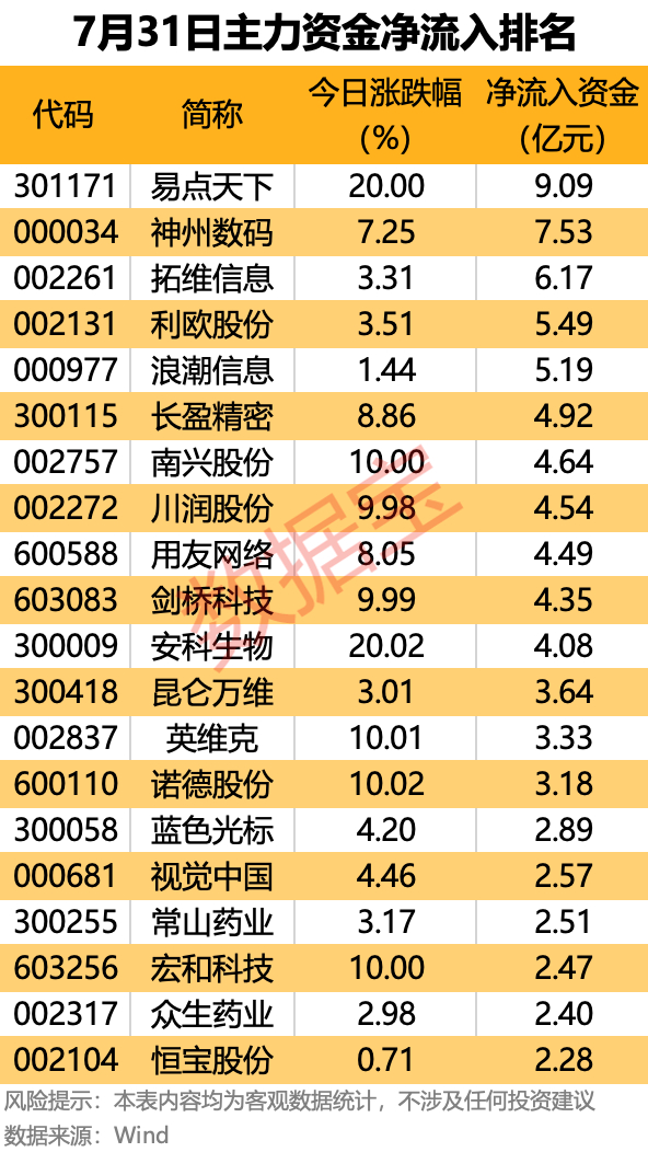 AI应用股易点天下主力资金净流入9.09亿元,居首。7月31日,AI应用板块大涨,该股“20cm”涨停。消息面上,英伟达上周向台积电追加30万块H20芯片订单,补充现有库存。机构分析认为,随着H20芯片恢复供应,国内大厂资本开支有望加速,AI应用需求将迎来爆发。