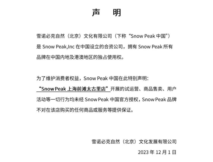 2023年12月1日,Snow Peak上海前滩太古里体验中心开业,在引发消费者打卡的同时,也引来了Snow Peak中国运营主体「打假」,品牌官方社交媒体账号却发布声明称该店并未获得中国合资公司的官方授权。