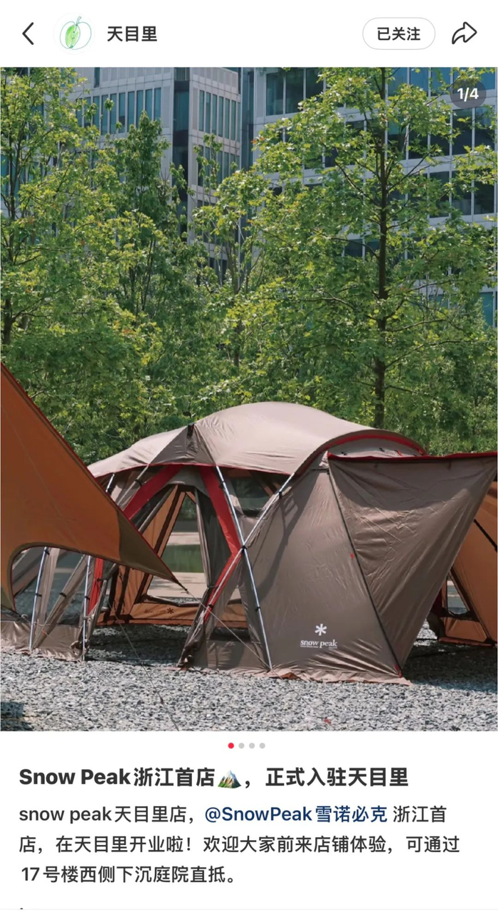 联商网查阅社交平台发现,2021年,Snow Peak在杭州青山湖开出门店,2023年6月,天目里小红书账号官宣,Snow Peak浙江首店正式开业。