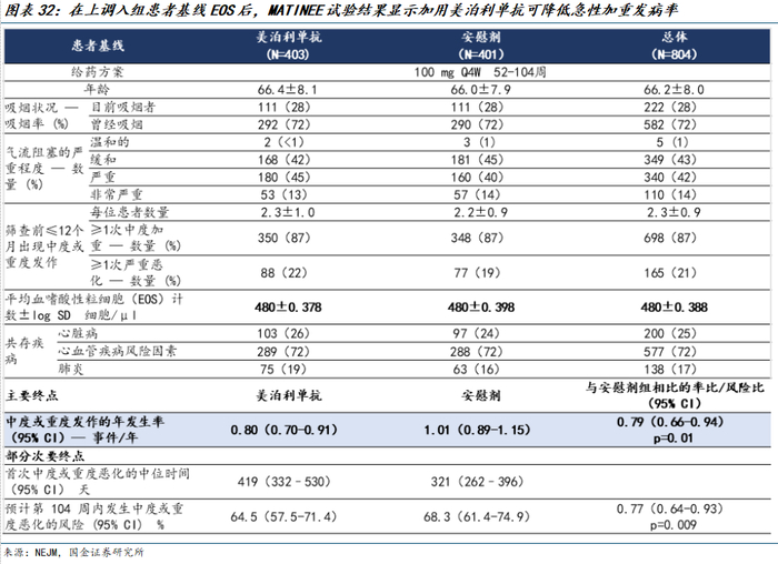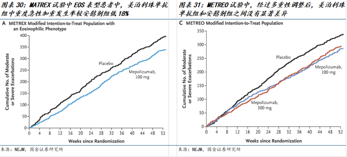 在METREX 试验中,嗜酸性粒细胞表型患者的中度或重度加重年发生率在美泊利珠单抗组中比安慰剂组低18%,在METREO试验中,经过多重性调整后,美泊利珠单抗组和安慰剂组之间没有显著差异。2018年,FDA拒绝了GSK就美泊利珠单抗就COPD适应症的上市申请,并在完整回复函中指出,需要更多临床数据才能获得批准。