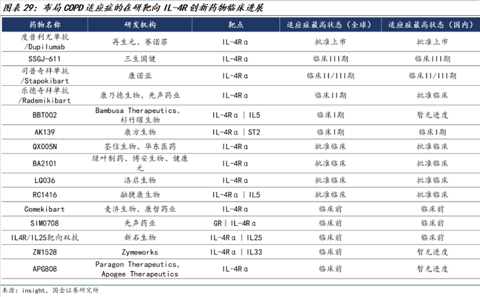 度普利尤单抗COPD适应症已于2024年9月在国内获批,目前国内已有多家企业密集跟进IL-4R靶点,其中三生国健、康诺亚、先声药业靶向IL-4R的创新药物COPD适应症研发进度处于国内第一梯队,均已进入临床II期或者更高阶段。