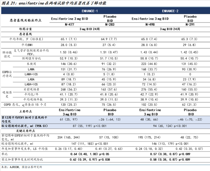恩司芬群III期临床试验 ENHANCE-1、ENHANCE-2分别纳入760、789例慢阻肺患者,与安慰剂组相比,恩司芬群治疗显著改善了患者肺功能(0-12小时平均FEV 1曲线下面积:ENHANCE-1,87 ml;ENHANCE-2,94 ml)。此外与安慰剂相比,ensifentrine治疗24周内降低了中度或重度发作的发生率(ENHANCE-1,率比:0.64;ENHANCE-2,率比:0.57),并延长了首次发作的时间(ENHANCE-1,风险比:0.62;ENHANCE-2,风险比:0.58)。