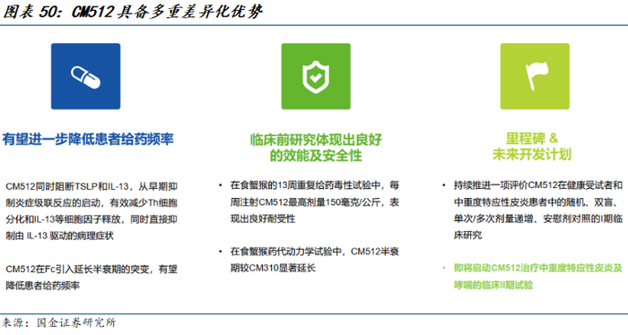 CM512是一种重组抗胸腺基质淋巴细胞生成素(TSLP)和抗白介素-13(IL-13双特异性抗体,同时靶向TSLP和IL-13。作用机制和体外药效学研究表明,CM512高亲和力结合TSLP和IL-13,阻断TSLP与胸腺基质淋巴细胞生成素受体(TSLPR)结合及IL-13/IL-13Rα1复合物与IL-4Rα受体结合,协同抑制由TSLP和IL-13诱导的下游信号通路和效应细胞活化。体内药效试验显示,CM512可以有效抑制过敏性炎症反应。此外,CM512还具有低免疫原性和长半衰期的特点,有望在临床上取得更好的治疗效果,进一步提高患者依从性。