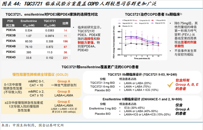 TQC3721(PDE3/4抑制剂)是一款PDE3/4双重抑制剂,目前已在中国完成II期临床试验,用于治疗中重度慢性阻塞性肺病。PDE3主要作用于支气管平滑肌,PDE4主要在各种炎症细胞中表达,TQC3721通过双靶点抑制,可以降低脱靶效应,并在一个化合物中结合支气管扩张和抗炎的双重活性。目前,国内尚无同靶点药物获批上市,TQC3721是中国研发进度最快的国产PDE3/4双重抑制剂。