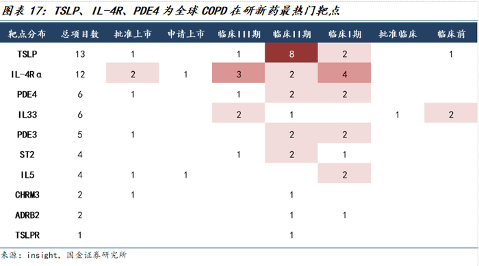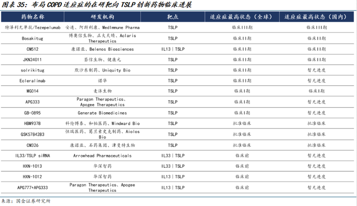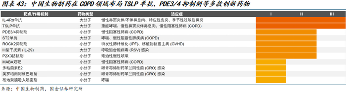 2) 关注在生物制剂赛道具有差异化优势的管线的标的,目前已获批用于治疗COPD的生物制剂覆盖人群有限,TSLP、IL-33/ST2等上游通路有望进一步拓宽适用人群范围并进一步提升疗效,建议持续关注相应分子临床进展。
