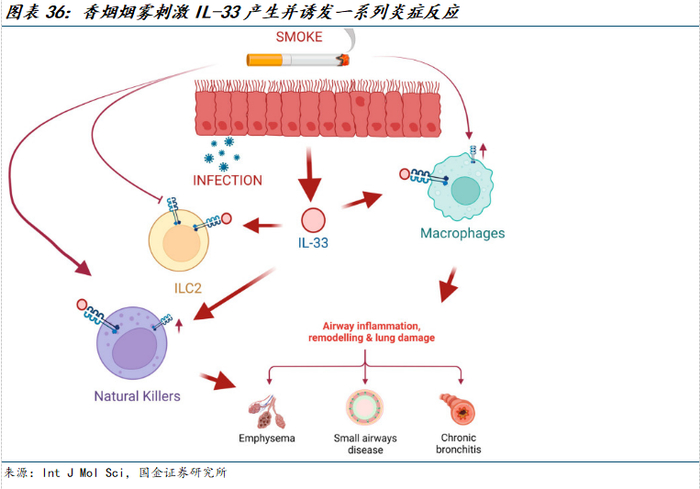 在肺中,IL-33 主要表达于气道上皮基底细胞、内皮细胞和成纤维细胞中,在 COPD 中观察到 IL-33 和 ST2 受体表达增加。香烟烟雾 (CS)是COPD发展的主要驱动因素,接触香烟烟雾不仅会增加上皮细胞和内皮细胞中 IL-33 的产生,还会导致外周血单核细胞 (PBMC) 中 IL-33 的表达增加,从而诱导免疫系统的持续激活,加速COPD 进展。香烟烟雾还会改变 ST2 受体的表达,从而加剧 COPD 急性加重引起的炎症。据报道,IL-33 可增加黏液生成和血管内皮通透性,从而进一步加剧炎症。