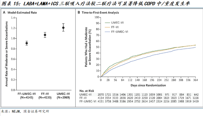 根据IMPACT试验(NCT02164513,纳入10355例COPD患者)结果,在52周的治疗期间,三联疗法组中/重度发作的发生率为每年0.91次,而糠酸氟替卡松-维兰特罗(ICS+LABA)组为每年1.07次(三联疗法发生率比:0.85,P<0.001),乌美溴铵-维兰特罗(LAMA+LABA)组为每年1.21次(三联疗法发生率比:0.75,P<0.001)。三联疗法组每年因重度发作而住院的发生率为0.13,而乌美溴铵-维兰特罗组为0.19(比率,0.66,P<0.001)。