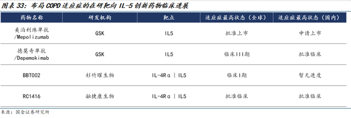 除GSK下一代长效IL-5单抗德莫奇单抗之外,全球仅杉竹曜生物、融捷康生物通过同时靶向IL-5和IL-4Rα的双特性抗体布局COPD适应症,目前均处于早期阶段。