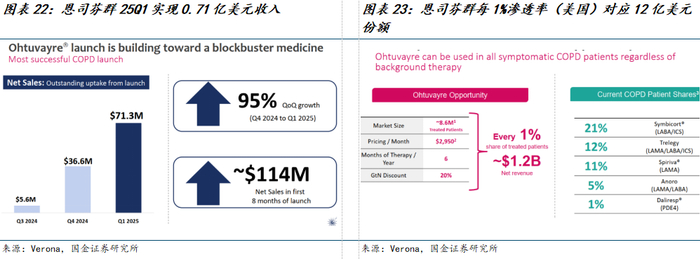 2024年3季度(首个完整销售季度)以来,恩司芬群商业化进展迅速。25Q1销售额达0.71亿美元,环比增长95%。美国市场现阶段接受治疗的慢阻肺患者约860万人,维持治疗方案主要以Symbicort(信必可/LABA+ICS)等支气管扩张剂或支气管扩张剂+ICS联合制剂为主,口服PDE4抑制剂(DALIRESP /罗氟司特)市场份额仅1%。根据Verona测算结果,恩司芬群每1%的渗透率对应近12亿美元的市场份额;2025年第一季度实际配发的恩司芬群处方约25000份,其中60%处方为可续配,后续销售增长动力强劲。