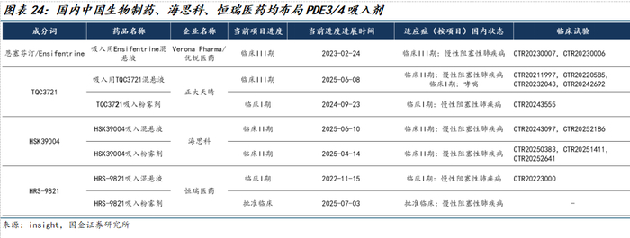 国内方面,正大天晴(中国生物制药)、海思科、恒瑞医药均在慢阻肺领域布局PDE3/4吸入剂产品,其中中国生物制药TQC3721混悬液(PDE3/4抑制剂)于2025年6月获CDE批准开展III期注册临床研究,用于慢性阻塞性肺疾病的维持治疗,临床进度仅次于Verona。