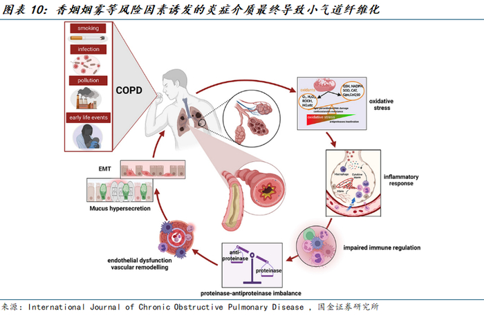 以上三种关键细胞因子均在刺激嗜酸性粒细胞向组织运输中发挥作用,临床上,这一系列效应导致COPD 患者出现特征性的气流受限。慢性炎症会导致患者出现持续性症状(呼吸急促、慢性咳嗽、咳痰),肺功能逐渐下降,并导致 COPD 病情加重。