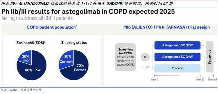 2025年7月21日,罗氏公布了关键性IIb期临床试验ALIENTO(受试者人数:1301人)和III期临床试验ARNASA(受试者人数:1375人)的最终结果。这两项临床试验旨在研究在中度至重度慢性阻塞性肺病 (COPD) 患者中,在标准维持治疗的基础上,将astegolimab与安慰剂进行比较。研究人群包括既往吸烟者及现吸烟者,且无论血液嗜酸性粒细胞计数如何,并均有频繁发作的病史。