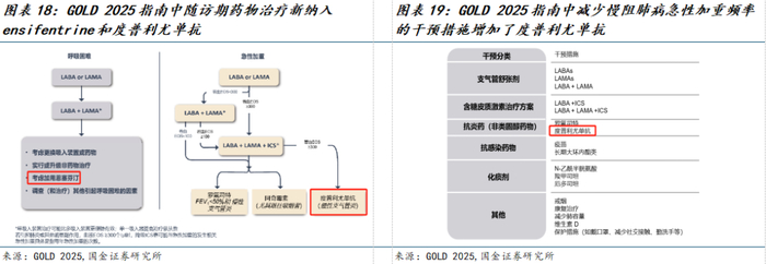 慢阻肺治疗主要以吸入性支气管扩张剂及吸入性糖皮质激素为主,GOLD2025指南推荐根据患者急性加重史以及肺功能情况对患者进行分组,并接受不同的初始治疗方案。按照疾病严重程度,依次接受单支扩剂、双支扩剂以及三联制剂。