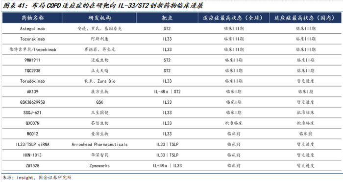 除MNC外,国内方面,迈威生物、正大天晴(中国生物制药)、康方生物、三生国健、荃信生物靶向IL-33&ST2通路创新药物COPD适应症均已进入临床研发阶段。