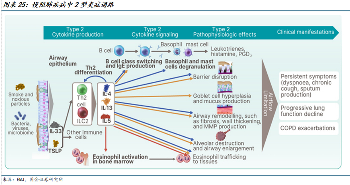目前2型细胞因子在伴有2型炎症的COPD中的潜在作用仍在不断阐明,IL-4、IL-13和IL-5对参与COPD病理生理和临床结果的细胞类型具有不同且重叠的影响。其中,IL-4是诱导幼稚T细胞分化为Th2细胞的关键细胞因子,并刺激嗜碱性粒细胞和肥大细胞脱颗粒;IL-13在杯状细胞增生和粘液产生中起着独特作用;IL-5在骨髓嗜酸性粒细胞活化中具有独特作用。此外IL-4和IL-13对B细胞类别转换和IgE产生、屏障破坏、气道重塑(例如纤维化、壁增厚和MMP产生)以及肺泡破坏和气道扩大具有重叠作用。
