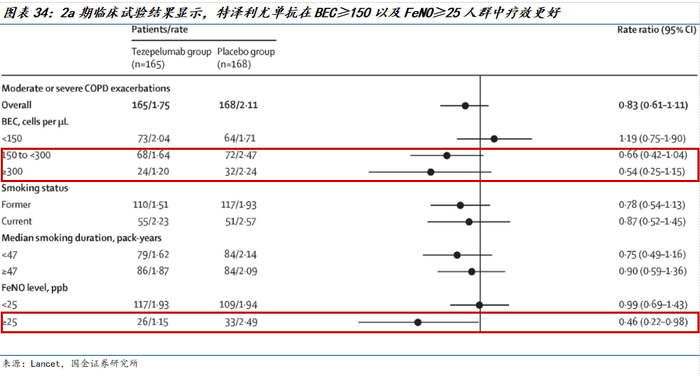 尽管分析结果显示无统计学意义,但按照血嗜酸性粒细胞计数(BEC)对受试者进行分层后分析发现,对于BEC≥150个细胞/微升的患者,与安慰剂相比,特泽利尤单抗可显著降低中度或重度急性加重的发生率37%。对于BEC≥300个细胞/微升的患者,特泽利尤单抗可使中度或重度急性加重的发生率在数值上降低46%。特泽利尤单抗治疗慢阻肺全球3期临床已于2025年3月开展。
