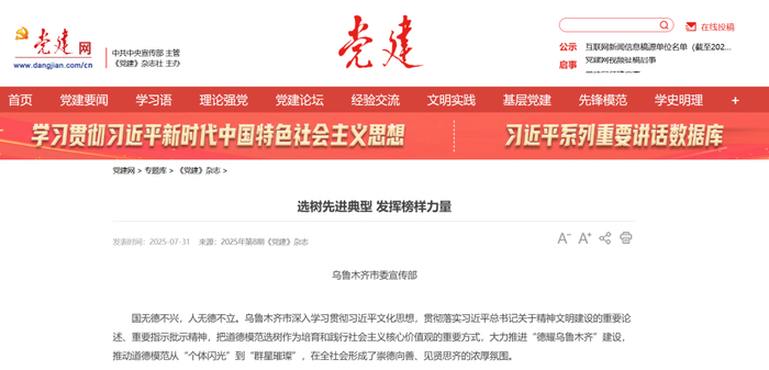 7月31日党建网刊发乌鲁木齐市委宣传部《选树先进典型 发挥榜样力量》,内容如下:
