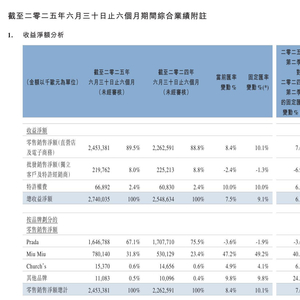 7月30日晚,Prada集团发布了2025年中期业绩:净收入27.4亿欧元,按固定汇率计(下同)同比增长9%,其中零售销售净额同比增长10.1%,公司净利润为3.86亿欧元,同比微增。其中,Prada品牌的零售销售净额同比减少1.9%,Miu Miu(缪缪)品牌的零售销售净额同比增加49.2%,净收入同比增长45.5%。