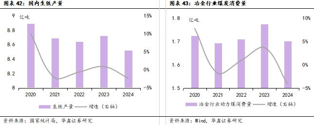 生铁产量下降,冶金用煤量下滑。煤炭冶金主要应用于炼钢,煤炭为目前钢铁行业的主要生产原料,为钢铁工业的“基本食粮”。由于钢铁行业产能过剩,利润减少,生铁产量出现下滑,2024年生铁产量为8.52亿吨,同比下降2.29%;2024年冶金行业动力煤消费量为1.7亿吨,同比下降4.07%。