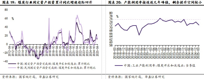 煤炭行业供给瓶颈逐步凸显,行业固定资产投资额增速处于下降趋势之中,产能利用率接近历史峰值无大量提升空间。由于煤炭产能过剩,2015年煤炭开采和洗选业固定资产投资完成额同比增速为-14.4%;供给侧改革影响下,2022年煤炭开采和洗选业固定资产投资完成额增速跃升至24.40%;边际来看,由于2025年以来大规模设备更新政策加力推进,制造业生产得到促进,投资额出现边际增长,2025年4月煤炭开采和洗选业固定资产投资完成额增速提升至14.7%。从产能利用率来看,2025Q1煤炭开采和洗选业产能利用率为71.90%,季环比-2pct,同比+0.34pct,并且距离近几年内76.4%的历史峰值增长空间较小。