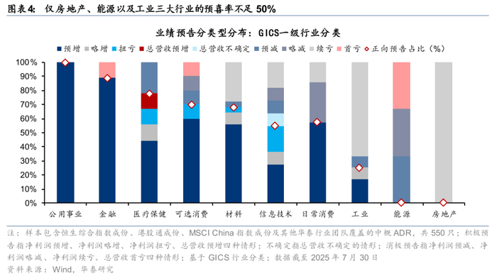 截至7月30日,我们统计的550只主要海外中资股共发布2025年中报业绩预告92条,预喜率达到60%,为2022年以来的最高值。从历史上看,海外中资股偏高的预喜率意味着盈利增速可能进一步上行,这与前述彭博一致预期的盈利增速变动一致(1H25 13% vs 24A 8%)。不过目前的披露率仅17%,较近5年最终披露率均值26%偏低,仍需持续追踪。分行业看,除电信服务(暂无已披露样本)、房地产、能源以及工业外,多数行业的预喜率超过50%,其中公用事业、金融、医疗保健的预喜率居前,均在75%以上。