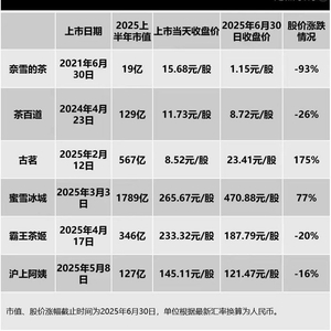 也有从业者认为,上市当天的涨幅并不能代表真实的市场现状,有些新茶饮品牌股价持续走低。为了观察更真实的市场反馈,以上半年为节点,「定焦One」统计了这六家公司上市当天和2025年6月30日的股价变化情况。