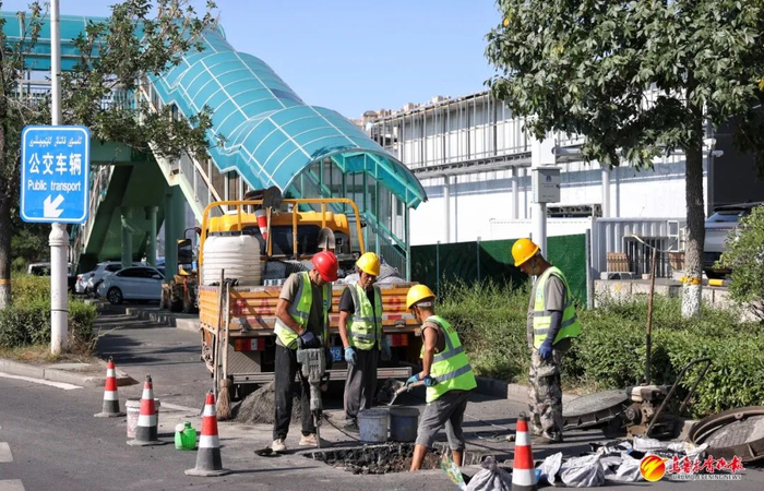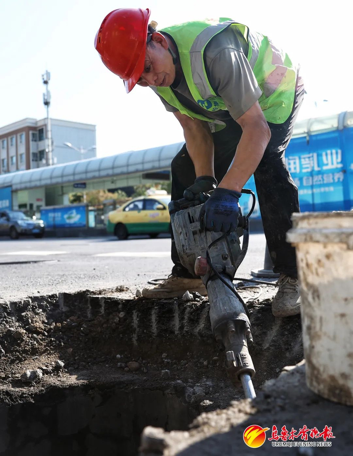 当日,在水磨沟区南湖北路上,记者看到,施工人员正在对一处破损井盖周边,进行修补作业。