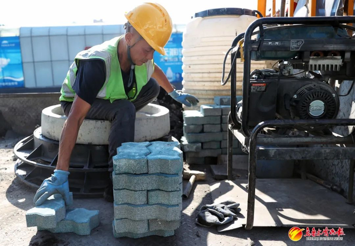 7月31日,立井街,工作人员准备井盖周边需要铺设的地砖。