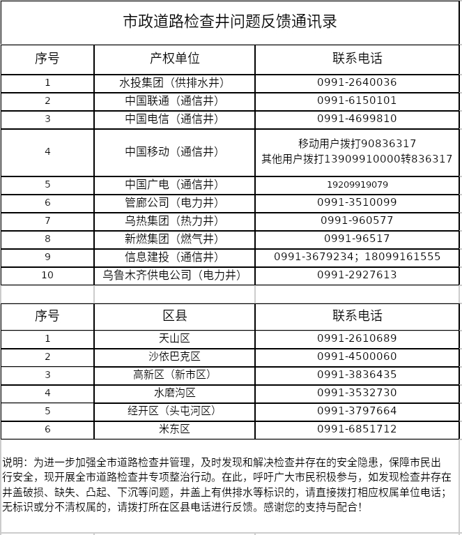“我们欢迎鼓励市民反馈检查井问题,已梳理各产权单位和各区城管局维修监督电话,现向社会公布,接受大家的监督。如发现检查井问题,请及时向产权单位或属地城市管理部门反馈。”梅文鹏说。