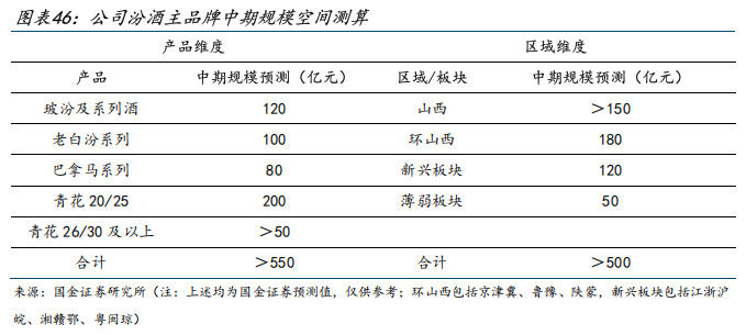 仅上述单品,我们预计中期维度公司收入天花板已可上看500亿:玻汾及系列酒120亿、老白汾系列100亿、巴拿马系列80亿、青花20 150亿、青花25 50亿。其中巴拿马与青花25侧重省内,玻汾、老白汾虽在省内有一定占比但并不占优,未来增量将主要源于省外。