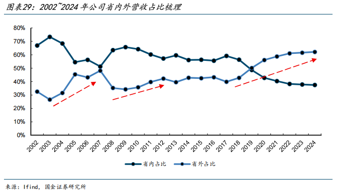 泛全国化酒企通常在行业景气上行期趁势外拓做全国化,汾酒亦然。公司近20年省外营收占比提升主要经历三轮:2003~2007年占比从26.6%提升至48.2%,2009~2012年占比从34.3%提升至42.2%,2017~2024年占比从39.9%提升至62.1%。每一轮行业上行期,公司均沿着相似的路线向外延伸。在近一轮上行周期,公司已进一步夯实了环山西市场的根基,并着重强化长江以南市场的氛围培育。