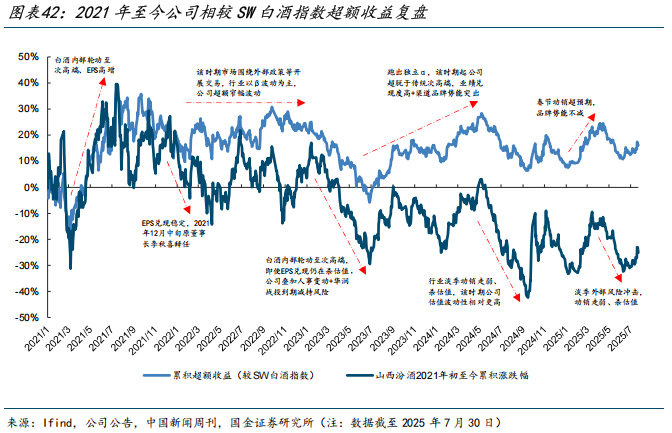 行业层面,2025年春节后白酒动销逐步回落,消费情绪与消费力仍处低位。5月起,“禁酒令”等外部风险发酵、致使相关消费场景缺失,加剧淡季行业景气冲击。为维持渠道秩序,酒企普遍放缓回款与发货节奏,公司亦是如此,但流通端品牌势能仍在上行。同时,行业景气下行传导至表观业绩,市场对公司EPS预期相应下修,我们认为目前股价也已反映相对谨慎的业绩预期。