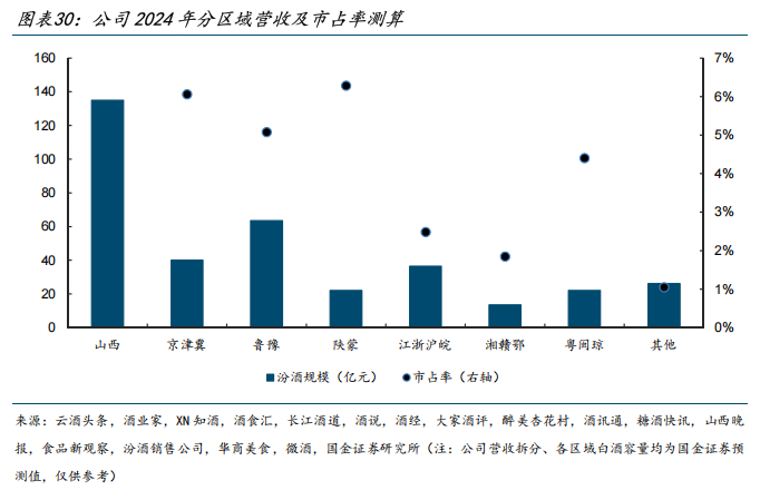 从2024年的营收结构来看,山西省内占比约38%,环山西市场(京津冀+鲁豫+陕蒙)占比约35%,其他区域占比约27%。环山西三大板块与山西毗邻,区域间人口流动频繁、白酒消费习惯与山西多有相似。